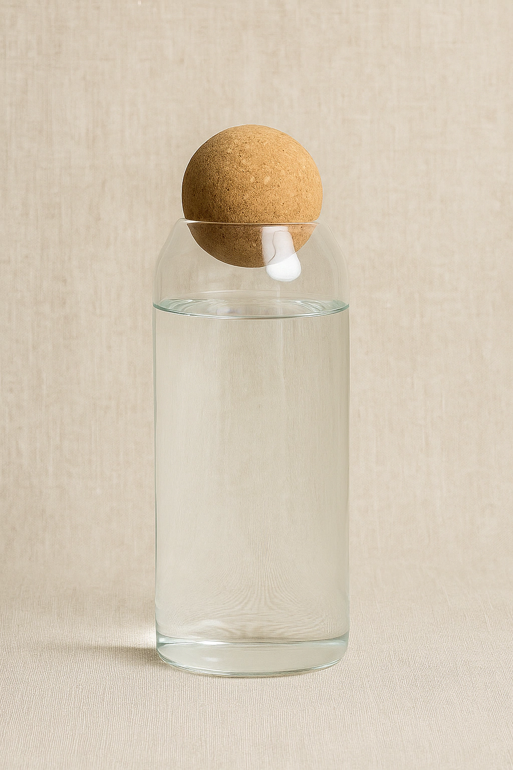 Jarra de vidrio con tapa circular y detalle decorativo centrado.