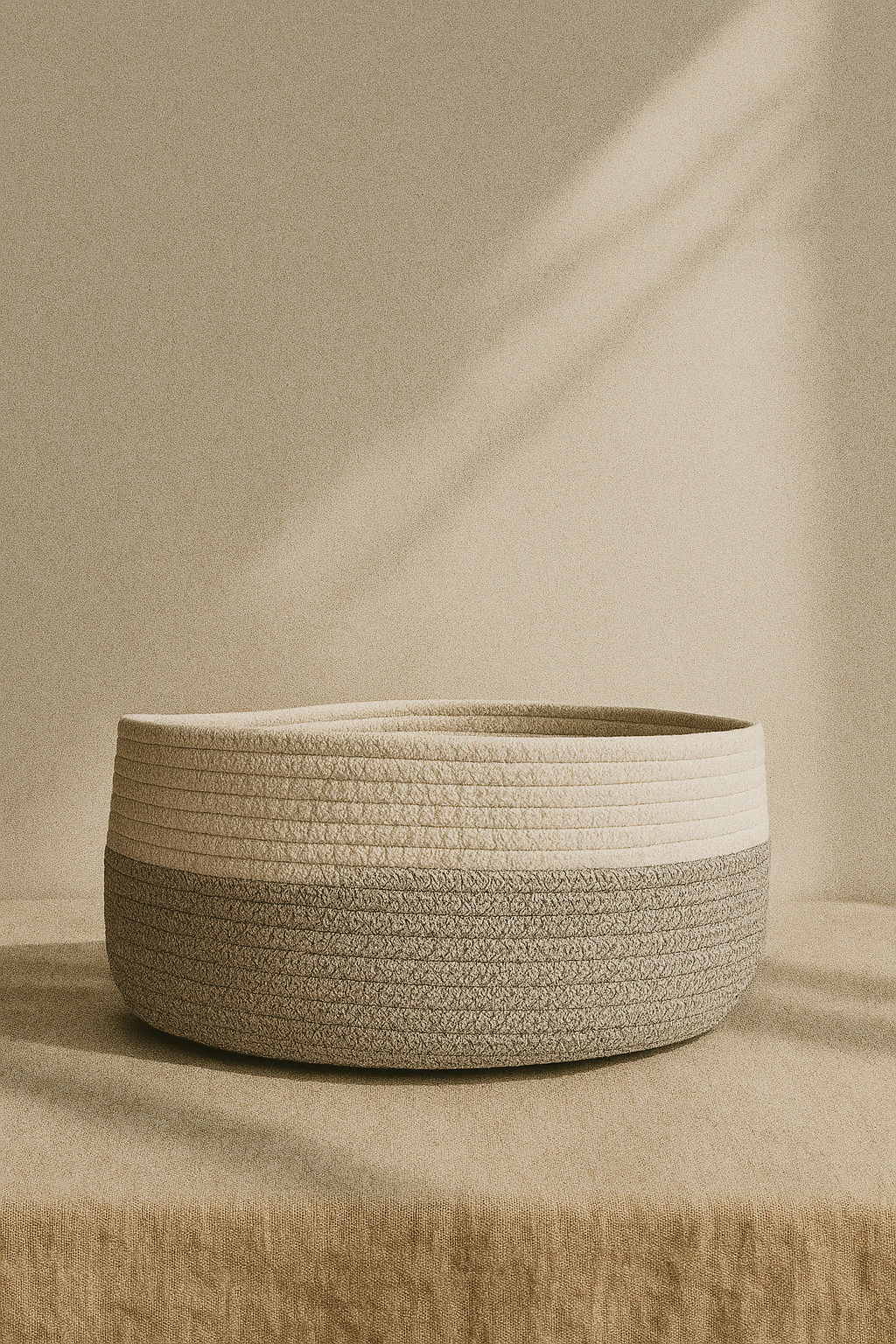 Organizador chico de algodón, suave y flexible, ideal para ordenar objetos pequeños en el baño, dormitorio o escritorio. Aporta textura y un toque cálido a cualquier espacio.